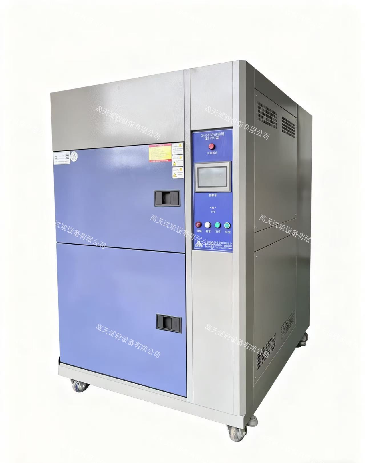1.箱設備區分為:高溫區,低溫區,試驗區三部分,測試產品置測試區,衝擊時高溫區或低溫區的溫度衝擊入測試區進行衝擊,測試產品為態式:
